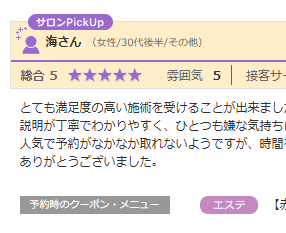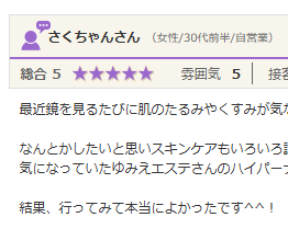 とても満足度の高い施術を受けることが出来ました。 説明が丁寧でわかりやすく、ひとつも嫌な気持ちになりませんでした。 人気で予約がなかなか取れないようですが、時間を見つけてまた行きたいと思います。 ありがとうございました。 ご予約メニュー:光...