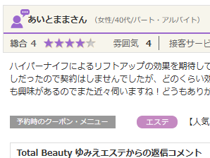 ハイパーナイフによるリフトアップの効果を期待してお試しで伺いました。担当の方が穏やかな雰囲気で話しやすかったです。今回はお試しだったので契約はしませんでしたが、どのくらい効果が持つのか経過観察しつつ良ければコース契約を考えています。また別の...